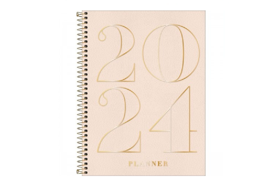 O Planner Executivo Espiral 20 x 27,5 cm Vanilla 2024 pode ser usado para organizar os compromissos do dia a dia, em casa e no trabalho. O produto possui capa em material especial, hot stamping, acabamento espiral, miolo com 80 folhas, com visões anual, mensal e semanal, e bolsa plástica.